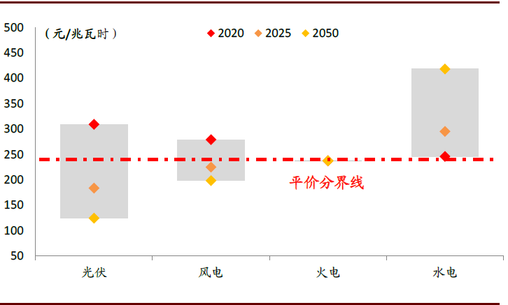 图表: 各电源度电成本横向比较2020~2050,东部区域(考虑西部电力特高压外送)