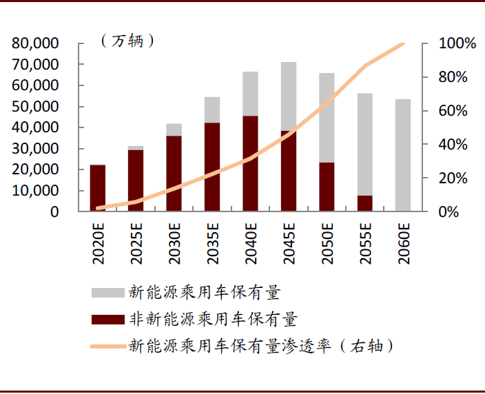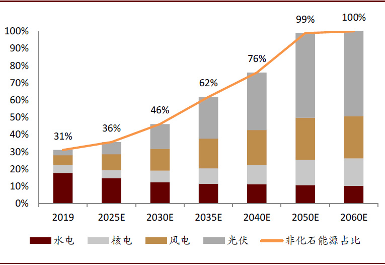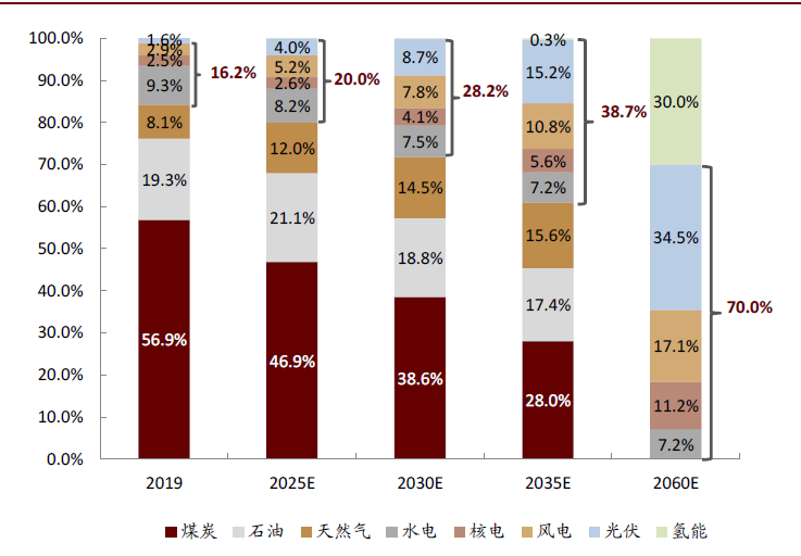►目前中国能源需求中非电占53.8%,但是在能源使用中,部分使用形式需要更高的能量密度,长期的储存,以及燃烧释放热能的形式,因此即使到2060年我们预计也将有30%的能源无法被电取代。