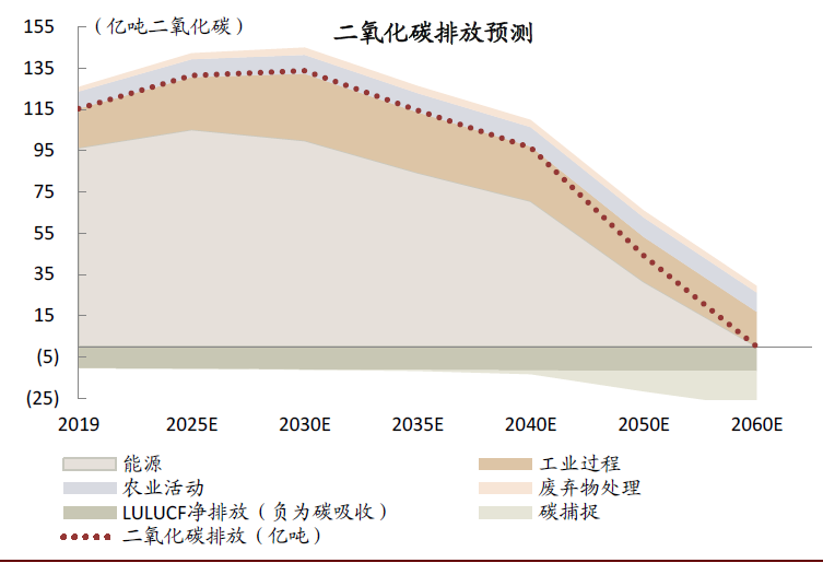 ► 节能减排+碳吸收等手段完成非能源领域碳中和。非能源板块(工业、农业、废弃物处理)随着发展需求增速放缓、节能减排效果显现,整体碳排量走弱,剩余量或由森林碳吸收、碳捕捉等手段达成“碳中和”。