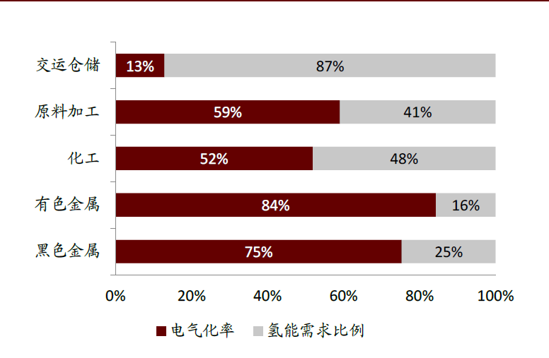 图表: 几个主要板块的电气化率预期以及预期氢能需求贡献比例(2060年)