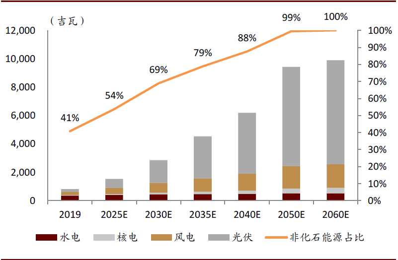 在电力碳中和的目标下,我们预计2025、2030、2035、2060年非化石能源电力装机将分别达到1,527、2,856、4,524、9,898吉瓦,占到全部电力装机的54%、69%、79%、100%。其中十四五期间光伏、风电年均新增装机分别达到74吉瓦和40吉瓦。发电量方面,随着装机量提升、传统能源退役,我们预计2060年非化石能源将贡献全部电量。