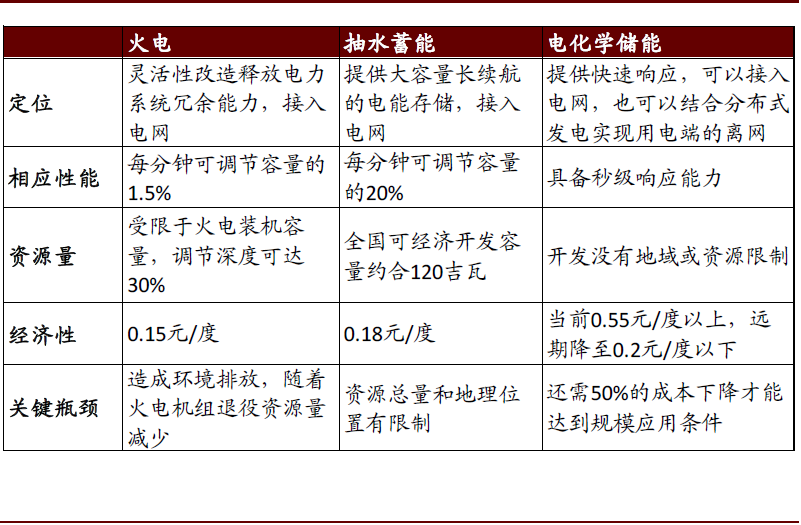 电力系统辅助服务市场的特征是多样、复杂、动态,市场的发展受到多重因素的影响。我们认为,虽然短期辅助服务市场发展易受到多重因素的干扰,但长期来看我们认为成本是电力辅助服务能源的核心竞争力:1)火电灵活性改造成本最优,碳排、响应性能欠佳,资源量随火电机组到期退役减少。2)抽水蓄能成本、性能介于火电和电化学之间,零碳排但资源量受到地域限制。3)电化学储能性能最佳、不受地域限制、可以匹配分布式,当前成本偏高但远期下降空间可期。