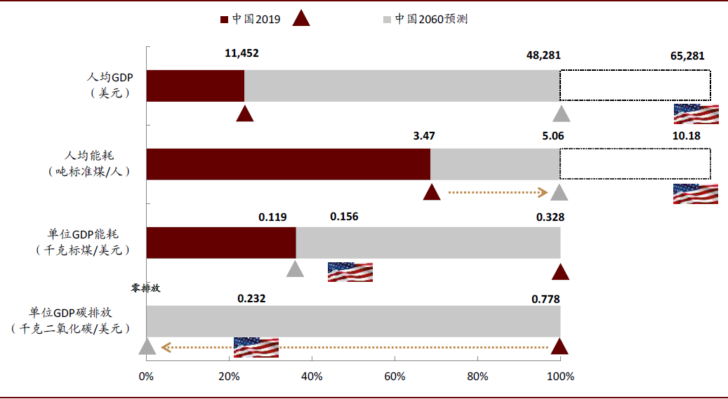 ► 从能耗和碳排放的角度来看,当前单位GDP能耗0.328千克标准煤/美元,而经济结构不断改善叠加各行业加速单位能耗控制,我们预计单位GDP能耗有望在2060年大幅回落64%至0.119千克标准煤/美元,低于当前美国和日本的能耗水平。而单位GDP排放水平也会从当前的0.778千克二氧化碳/美元不断走低,在2060年完成能源零排放、以及碳捕捉等方式达成非能源领域碳中和目标。
