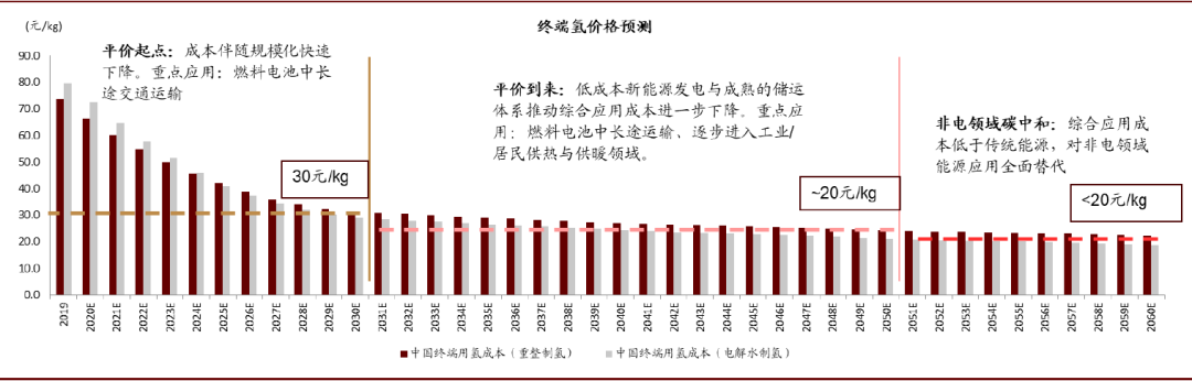 2031E-2050E:步入平价,应用领域拓宽,供给与应用规模大幅提升。我们认为,在这一阶段,氢能源的成本受益于富电区域新能源发电的低电价,与逐步完备的中长距离运输/管路,使得加氢成本逐步下降至近20元/kg。同时新能源电解水制氢也将逐步成为氢能供给的主流模式。对于燃料电池车辆,当不考虑柴油针对碳排成本上升时,氢成本下降至20元/kg可直接与柴油平价。此外,此阶段的非交通领域用氢的价格已逐步下降至18-20元/kg(即不考虑加氢站的加注成本),在工业与家庭供暖领域已逐步具备一定经济性基础,我们认为通过初期与天然气的混合使用,以及伴随氢价格的进一步下降,在供暖领域,氢能也将逐步提升应用渗透率。