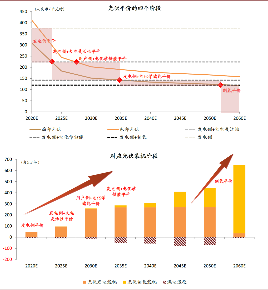 ►第三阶段(2035~2050):发电侧+电化学储能全面平价。这一阶段,可再生能源渗透率提升+火电机组到期退役,而光伏+储能成本继续下降至发电侧平价空间完全打开,光伏扔掉拐杖成为主力电源。基于此,我们2060年的电力结构预测光伏多于风电,而非落在多能互补的最优配比,本质是光伏降本的更大潜力,使得光储达到完全平价条件。