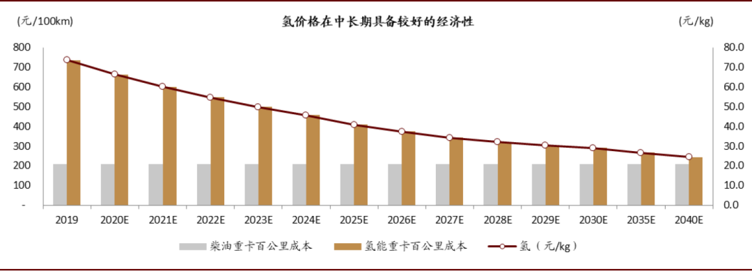 图表: 不考虑燃油综合使用成本提升下,重卡领域氢价格低于20元/kg将具备与柴油的直接平价能力