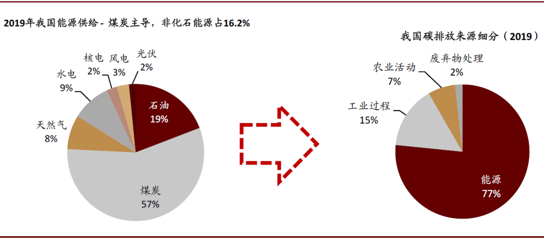当前我国能源供给仍以煤炭消费为主,能源是二氧化碳排放的第一大来源。2019年,我国共产生能源消费48.6亿吨标准煤,虽然提早完成了非化石能源15%的目标,但其中大部分仍来自于煤炭(占比57%)。根据我们估算,2019年我国或产生二氧化碳排放125.9亿吨(未扣除碳吸收部分),同比增长2.8%。其中能源部分同比增幅2.6%,仍占据碳排放总量的77%。