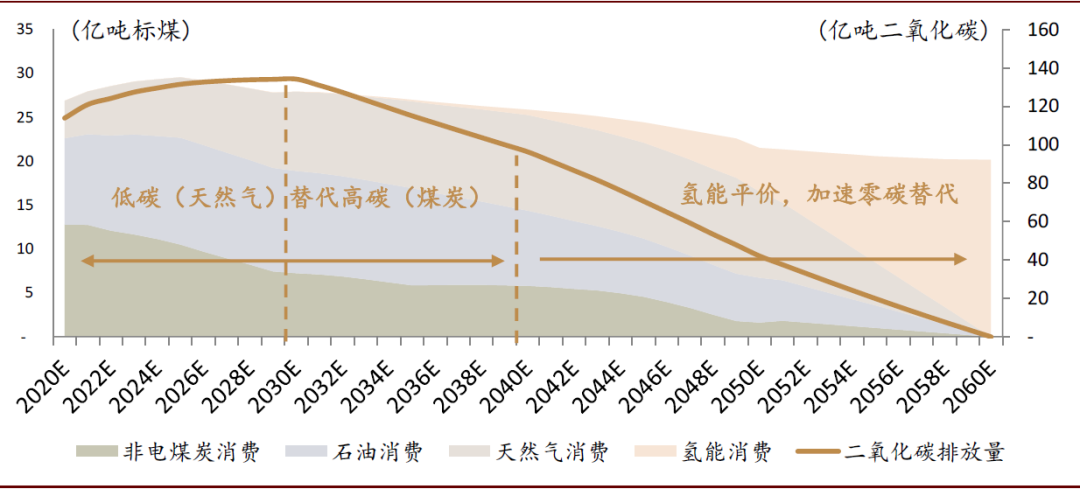 ►非化石能源+氢能逐步形成传统能源替代,在不增加碳排放的情况下支撑能源消费上行。我们认为要达到最终“碳中和”目标,可预见的电能使用比例不断提升,各行业都最大范围实现电气化,并且电能逐步由非化石能源满足。化石能源方面,2025-2028年间,煤炭、石油消费量占比从2025年46.9%和21.1%,分别下滑至42.3%和19.7%,而天然气将从12.0%小幅上升至13.5%。此外,我们认为2035-40年氢能将起步,并在2040年后开始逐步迈向平价,与非化石能源电力一起形成对传统能源的替代,并带来天然气消费于2049年达峰后回落,由氢能支撑能源消费增长、同时不产生二氧化碳。随着煤炭、石油消费在2028年达峰,排放总量将同时实现峰值,并在2060年非化石能源和氢能全面取代后,达成零排放。