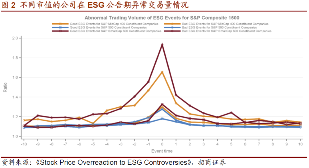 ●1)当发布公司负面的ESG新闻时,会对股价产生负面的公告效应,即负的累计异常收益,并且公告期间的交易量会有所增加;
