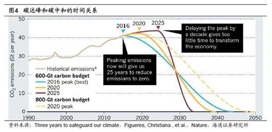 那么二者在时间上是什么样的关系?根据Figueres等学者的测算,如果2016年实现碳达峰,仍需随后的25年时间达到碳中和。倘若碳达峰的时间不断延缓,而要完成控制气温提升的计划,需要碳中和在更短的时间内实现,难度也将加剧。这也说明为了尽快实现碳中和,全球减碳需提速。