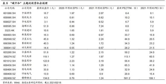 海螺水泥(600585.SH):具备技术、资源优势的水泥龙头,碳中和趋势下份额增长可期。1)技术优势方面,海螺于2018年建成世界首条水泥窑烟气二氧化碳捕集纯化示范项目,规模为5万吨二氧化碳/年,实现了二氧化碳资源化利用,同时其通过提升能源利用率、采用替代燃料/原料、利用水泥窑余热、富氧燃烧等方面均有充分储备;2)资源优势方面,根据我们测算,2019年海螺水泥拥有石灰石矿山储量约122亿吨,占全国探明水泥用灰岩矿资源达9%,远超竞争对手。按照储量/熟料产能计算,海螺水泥的资源储量可支撑目前熟料产能生产年限达48年,同样远超竞争对手。这就奠定了海螺水泥在未来行业减产时期具备获取更多份额的基础。预计公司2020/2021年对应EPS为6.88/7.24元,“优于大市”评级。