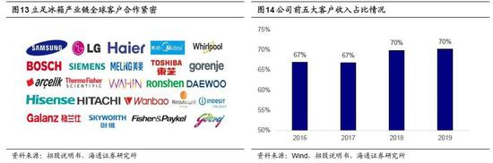 公司主要客户包括众多国内外知名家电制造企业,依据其招股说明书披露,公司国际客户包括LG、三星、东芝家电、日立、阿奇立克、斐雪派克、惠而浦、博西家电等;国内客户包括海尔、美的、美菱、海信等知名品牌家电生产企业。同时,公司亦向美国赛默飞世尔、海尔生物医疗等医用研究或运输保温设备生产企业提供产品。公司目前产品主要应用领域为冰箱产业,依据公司招股说明书披露,2019年上半年公司前五大客户分别为韩国世永(终端客户为LG)、三星、美的、惠而浦及青岛海尔,2017-2019年,公司前五大客户合计收入占比分别为67%、70%及70%,公司立足冰箱产业链上游,与下游品牌厂商维持良好合作关系。