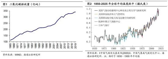 碳排放强度不减,气候变暖威胁袭来。进入工业化时代,全球二氧化碳(CO2)的排放强度急剧提升。2019年全球CO2排放量达到341.7亿吨,是1965年的3.1倍,尤其是2000年以来增速明显提升。随着CO2浓度的短期剧增,全球气温快速升高。而一旦气候加速变暖,风暴、热浪等极端天气频繁袭来,不仅危及人类生活,也会造成较大规模的经济损失。