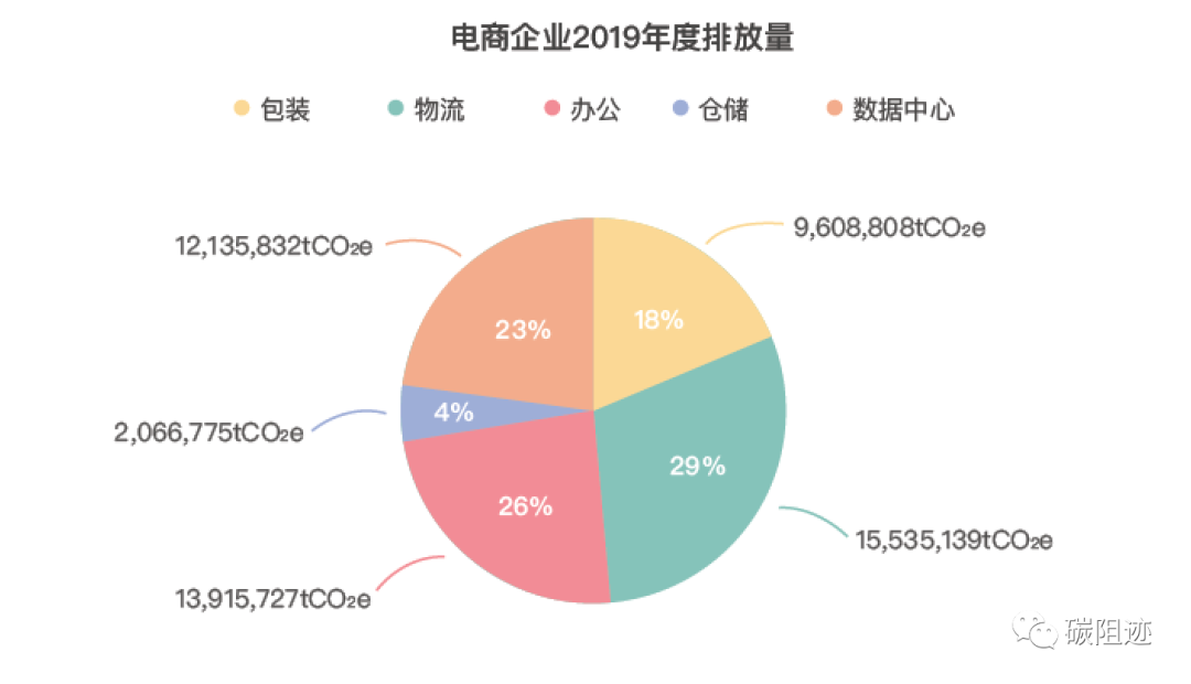2.中国电商的碳排放来源主要包括:包装,约占18%;物流,约占29%;办公,约占26%;数据中心,约占23%;仓储,约占4%。