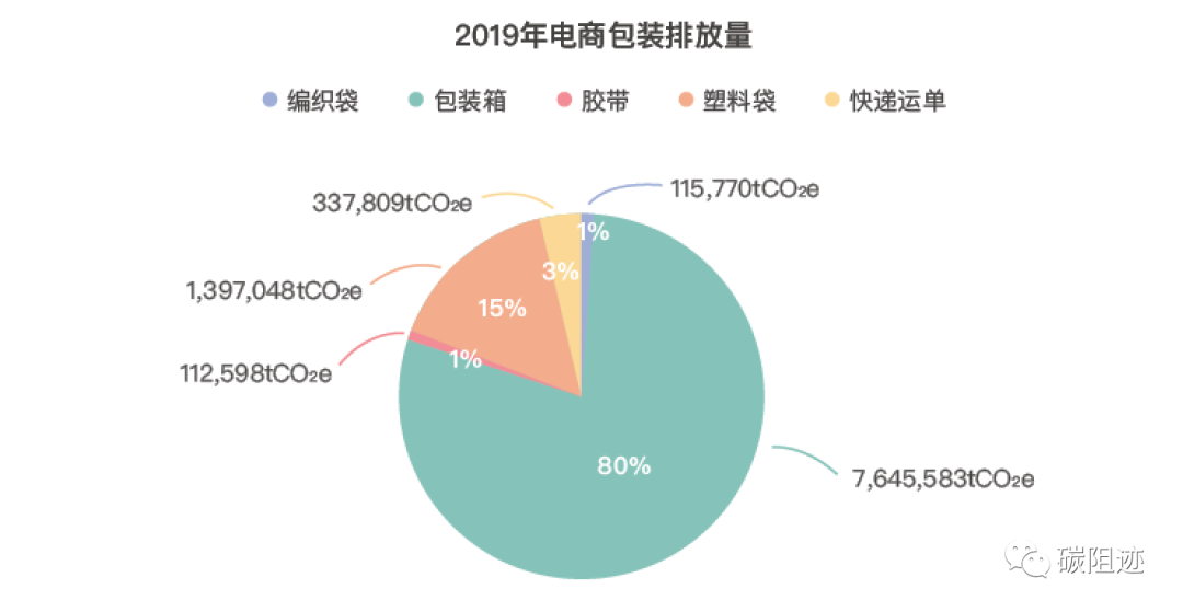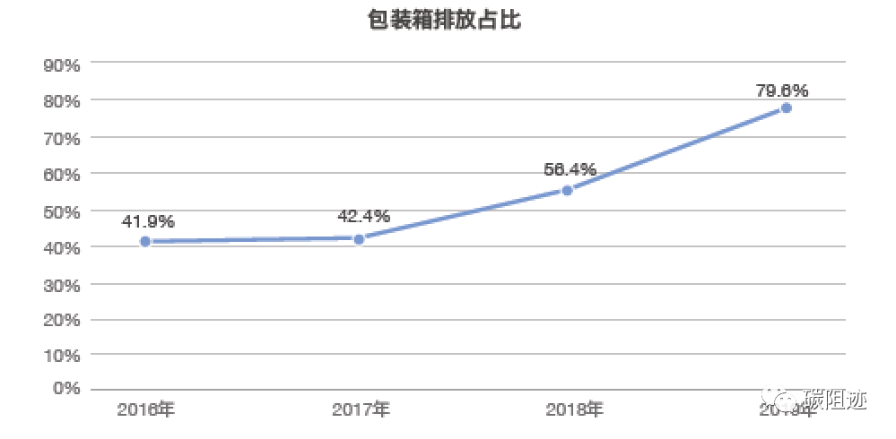 由于编织袋、快递运单、胶带等采取的一系列措施,包装箱占电商包装的排放逐年上升,由2016年的42%上升到2019年达到80%。