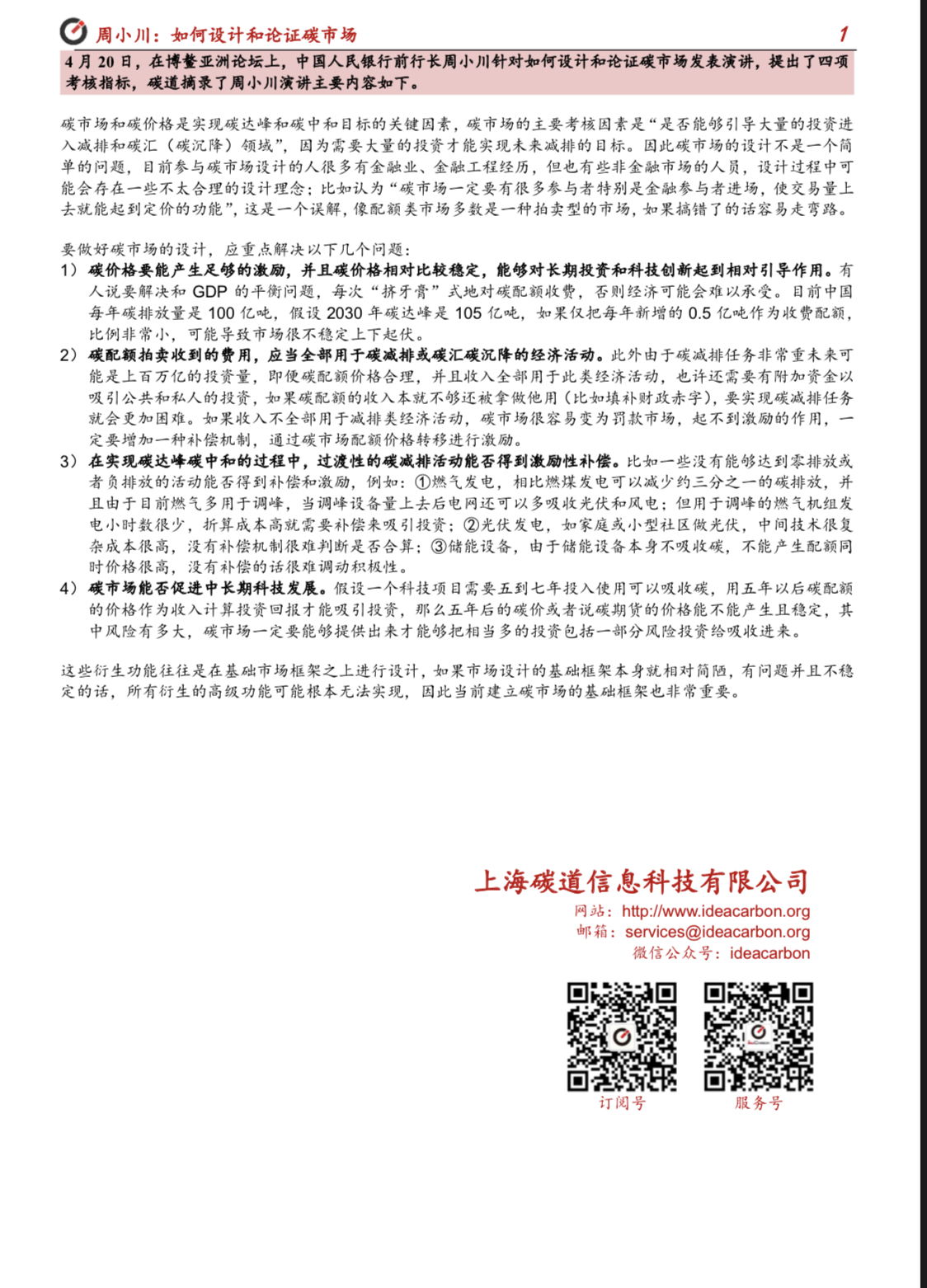摘要:4月20日,在博鳌亚洲论坛上,中国人民银行前行长周小川针对如何设计和论证碳市场发表演讲,提出了四项考核指标,碳道摘录了周小川演讲主要内容。