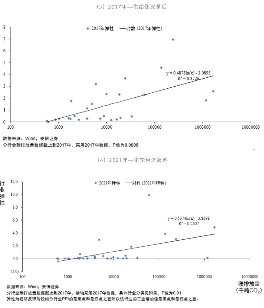 这些结果暗示,在经济周期性的恢复过程中,碳排放较大的产品价格弹性更大。但是,2017年以及2021年的经济恢复过程中,这些产品价格的弹性出现了显著上升,显示其供应受到了较强的抑制作用。2017年的情况显然与供给侧改革密切关联;2020年以来的情况当然可能有疫情的影响,但碳排放控制的作用不可忽视。