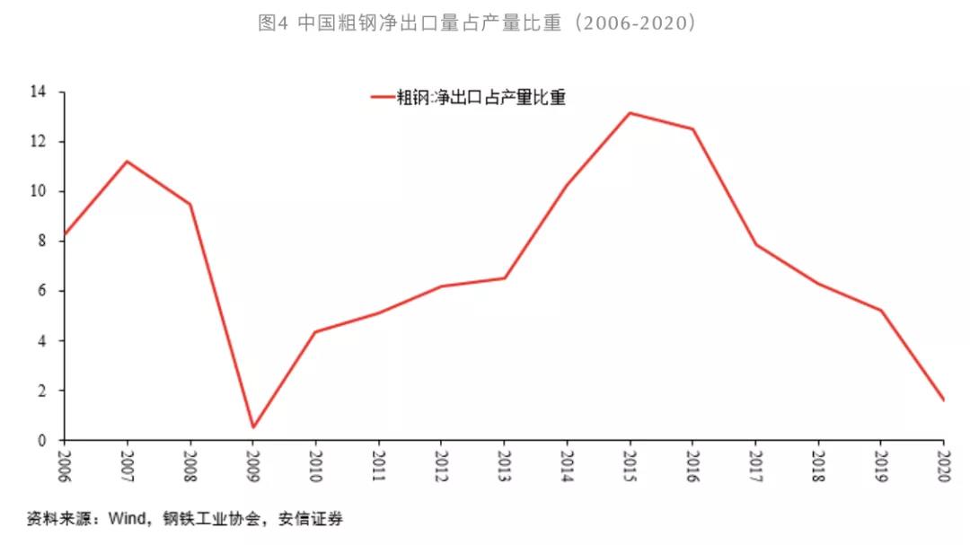 第一,在2015~2016年期间,中国是全球最大的钢铁出口国,粗钢净出口在2015和2016年占到了中国钢铁生产能力的12%。如果折算为粗钢,2015年,中国粗钢净出口总量可能与日本的钢铁生产总量相当。但是2017年以后,中国粗钢净出口量迅速减少,疫情以来持续加速下降。中国粗钢出口大幅降低,有助于改善全球钢铁市场的平衡。带来这一现象的部分原因是当年供给侧改革提升了环保要求,以及2020年以来中国为了控制碳排放所采取的一系列努力。