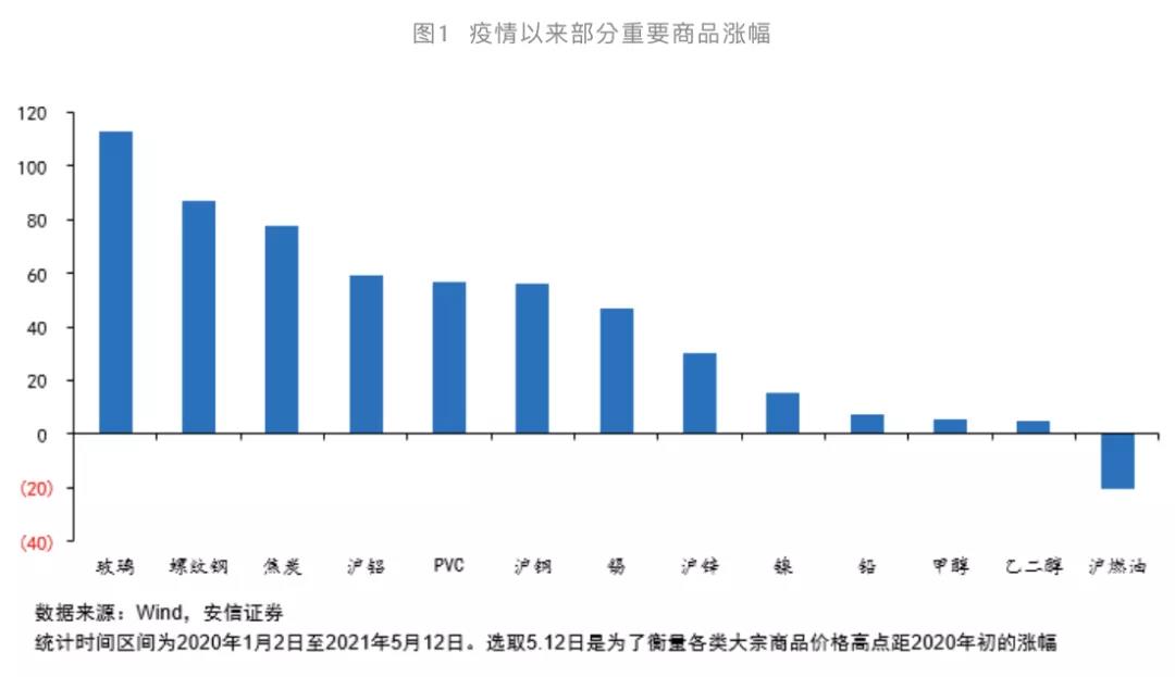 观察不同门类商品的涨幅可知,尽管大多数商品涨幅非常大,但不同商品之间的涨幅存在着明显差异。例如,铜因涨幅很大而受到国内外普遍关注,但玻璃和螺纹钢的涨幅实则更加显著,与此同时,甲醇、乙醇等涨幅较低。可以看出,受中国政策和需求影响比较大的商品,涨幅更为显著,例如螺纹钢、焦炭、玻璃等,受其影响比较弱的商品,涨幅相对较弱。