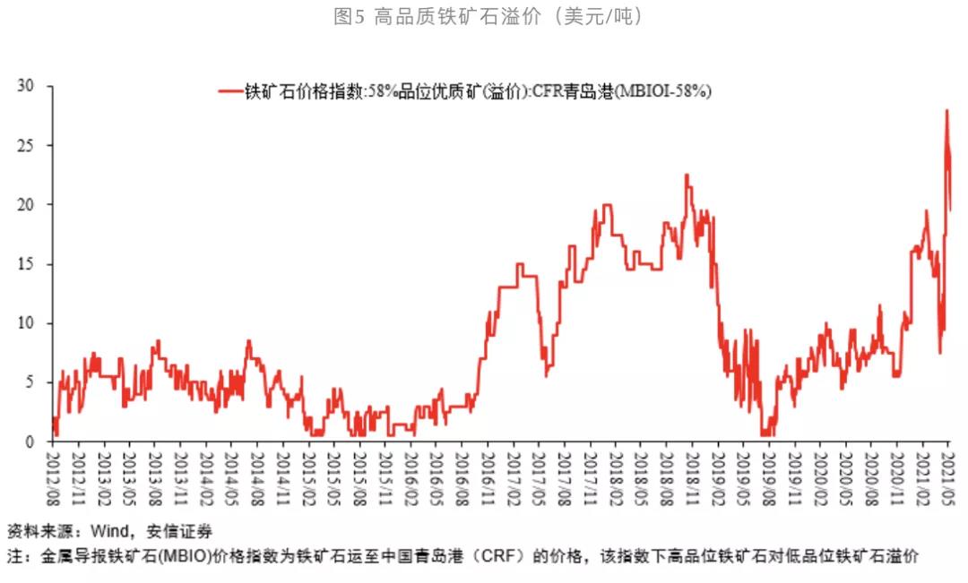 通过计算高品质铁矿石相对低品质铁矿石的溢价可以看出,2016年至2017年底,高品铁矿石溢价显著抬升。2020年底开始,这一溢价再次出现显著上升,反映了政府控制钢铁生产总量的政策努力。