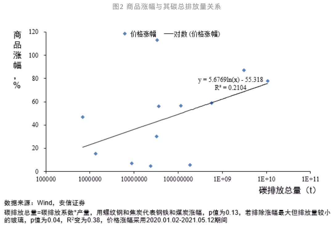 为了更好地刻画这一情况,我们将之处理为散点图(见图2)。图中,纵轴是不同门类商品在同一时间内的价格涨幅,横轴是该商品所在行业生产过程中碳排放的总量。结果显示,某种商品在生产过程之中,碳排放总量越大,价格涨幅也越大。这说明,本轮商品价格上涨的部分原因可能与碳排放控制存在关联。