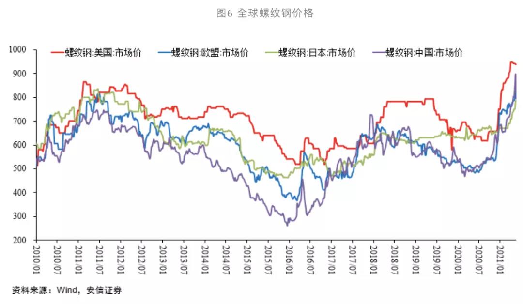 第三,全球钢铁市场的价格变化。图6显示了螺纹钢的全球价格,包括美国、欧洲、日本和中国的价格。2017年之前,中国的螺纹钢价格一直为全球市场最低,为全球市场价格提供了基准。但2017年以后,中国螺纹钢的价格相对国际市场的折价基本消失,同时国际市场价格中枢出现抬升。中国螺纹钢折价的消失与中国钢铁出口下降同时发生,显示了中国钢铁供应收紧的影响,背后与供给侧改革、污染物排放控制以及近来的碳排放控制存在紧密关联。