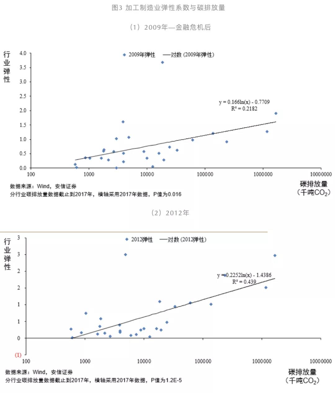 接下来,我们在加工领域对广泛的工业品价格作更一般性的观察。过去十年里,全球经济在2009、2012、2017以及2020年,经历了四轮比较明显的波动,并出现了明显的底部爬升。通过对这几轮经济恢复过程的比较,我们可以分析一般制造业领域的行业价格弹性与碳排放总量的关系。