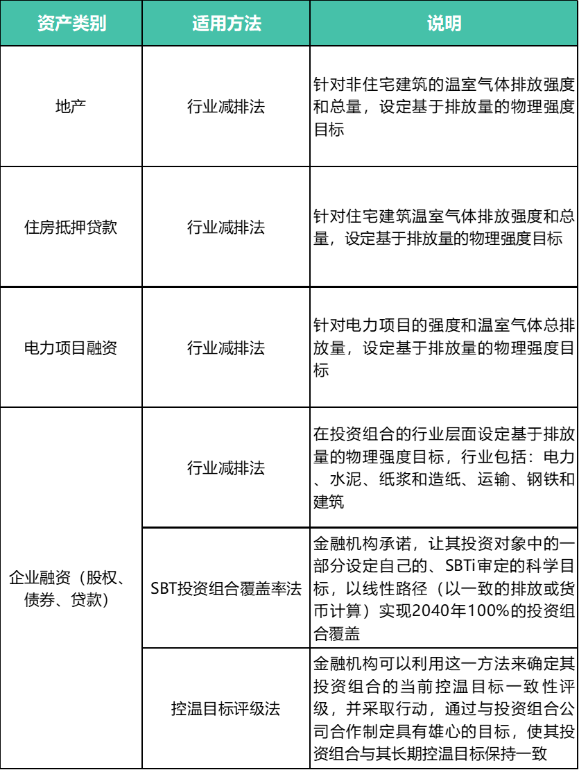 为将实体经济中的减排目标与金融活动相关联,帮助金融机构设定科学碳目标,科学碳目标倡议(SBTi)开发了《金融机构科学碳目标指南》。该指南于2020年10月发布,并于2021年4月更新;目前适用于以下金融机构和资产类型,未来随着方法论的不断开发,将覆盖更多类型的金融机构与资产类型。