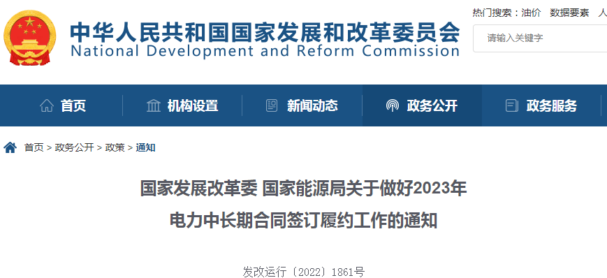 12月22日,国家发改委、国家能源局发布《关于做好2023年电力中长期合同签订履约工作的通知》,通知指出,