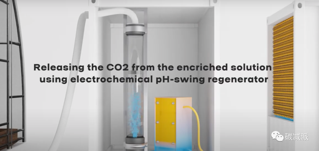 3. 利用电化学装置ph-swing从浓缩溶液中释放二氧化碳。