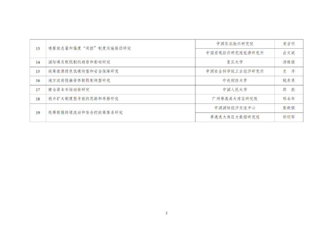 名单包括:碳排放总量和强度“双控”制度实施路径研究、国际碳关税机制的趋势和影响研究、统筹能源绿色低碳转型和安全保障研究等19个课题。