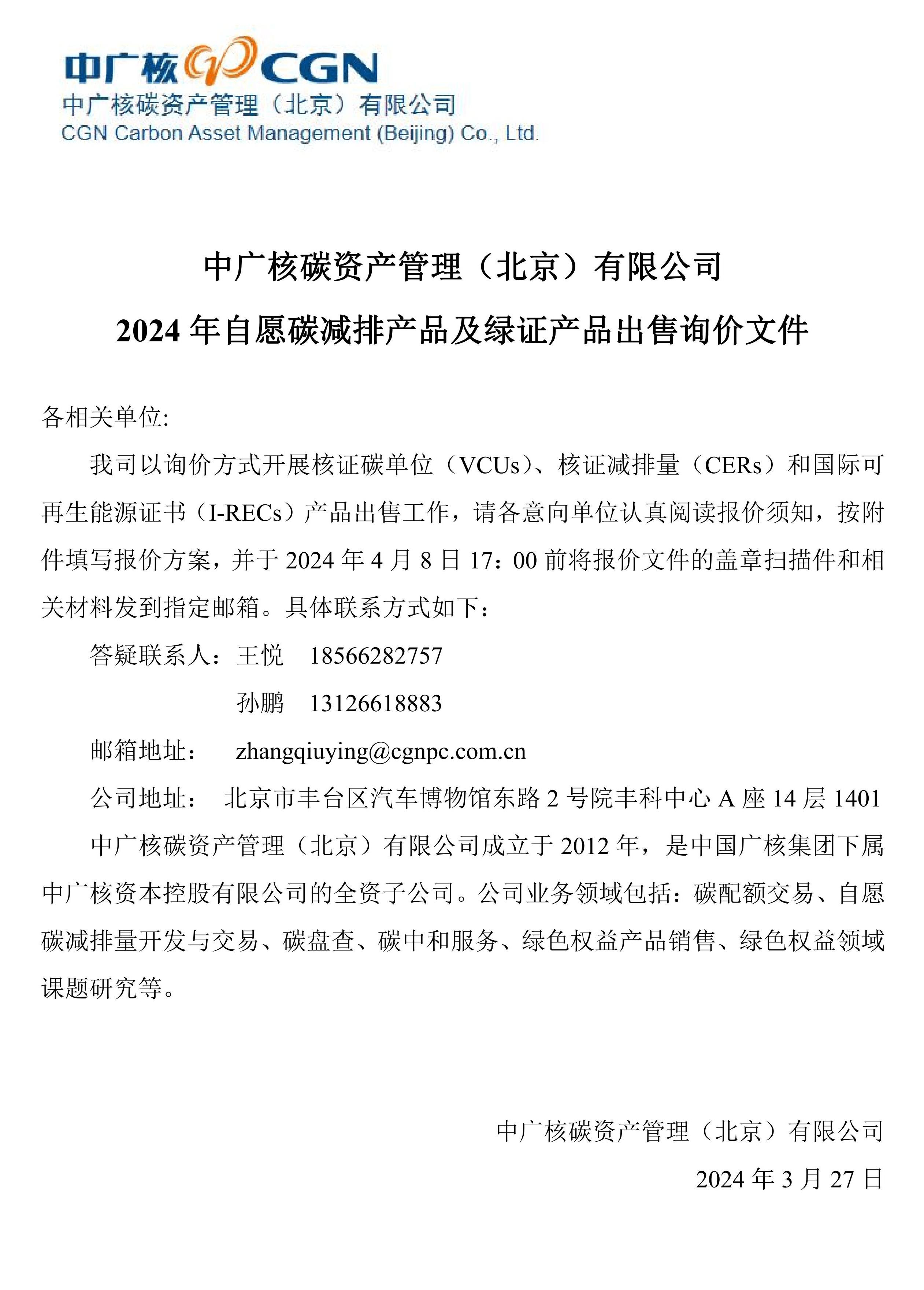 中广核碳资产管理(北京)有限公司 2024年自愿碳减排产品及绿证产品出售询价