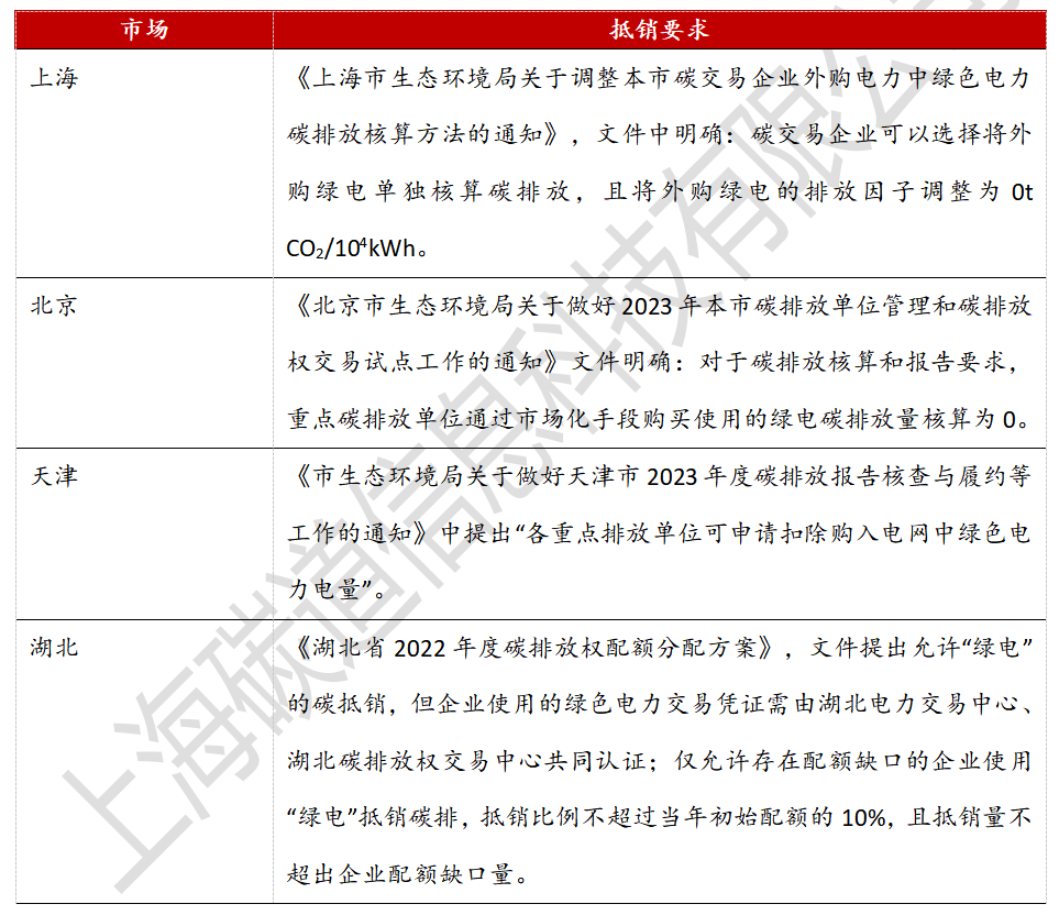 目前绿电绿证代表的年间接碳减排量预计高达17亿吨左右,如果无区别全部纳入全国碳排放权交易市场扣除企业碳排放,将会动摇全国碳排放权交易市场的基础,也会对全国温室气体自愿减排交易(CCER)市场造成巨大冲击。截止2024年6月,全国试点碳市场仅上海、天津、北京、湖北共四个市场明确允许使用绿电进行排放抵销。