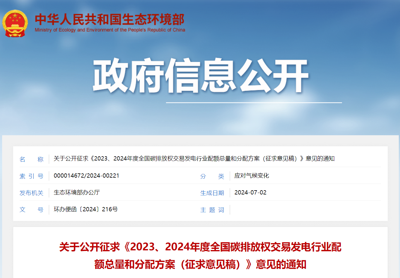 关于公开征求《2023、2024年度全国碳排放权交易发电行业配额总量和分配方案(征求意见稿)》意见的通知