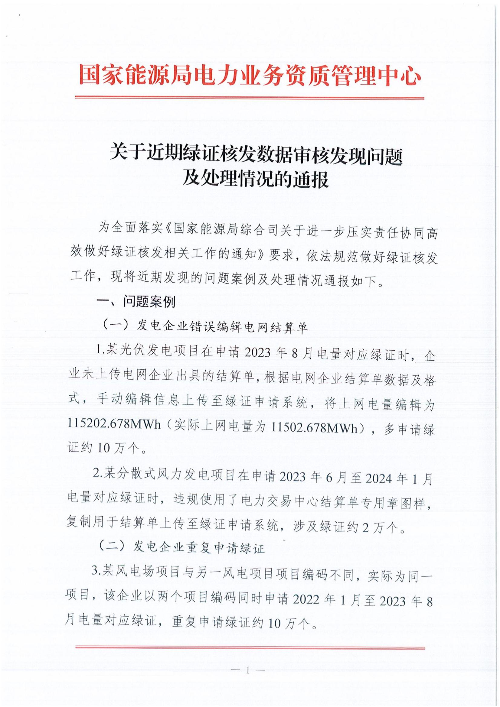 国家能源局通报近期绿证核发数据审核发现问题及处理情况