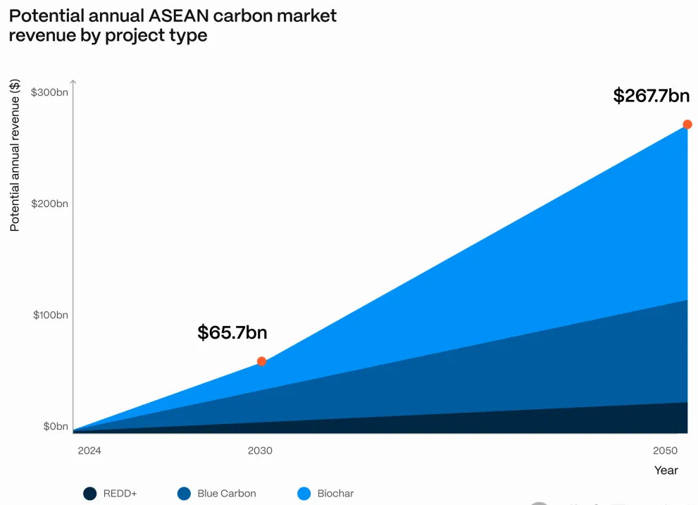 从图表中可以看出,预计到2030年,东盟碳市场的潜在年收入将达到657亿美元。这个数字在2050年将显著增长至约2677亿美元。这一增长趋势表明,随着时间的推移,碳市场项目的收入将大幅增加,尤其是生物炭项目,其增长趋势在图中占据了最大的份额,显示出生物炭项目在未来碳市场中的重要性和潜在的经济影响。