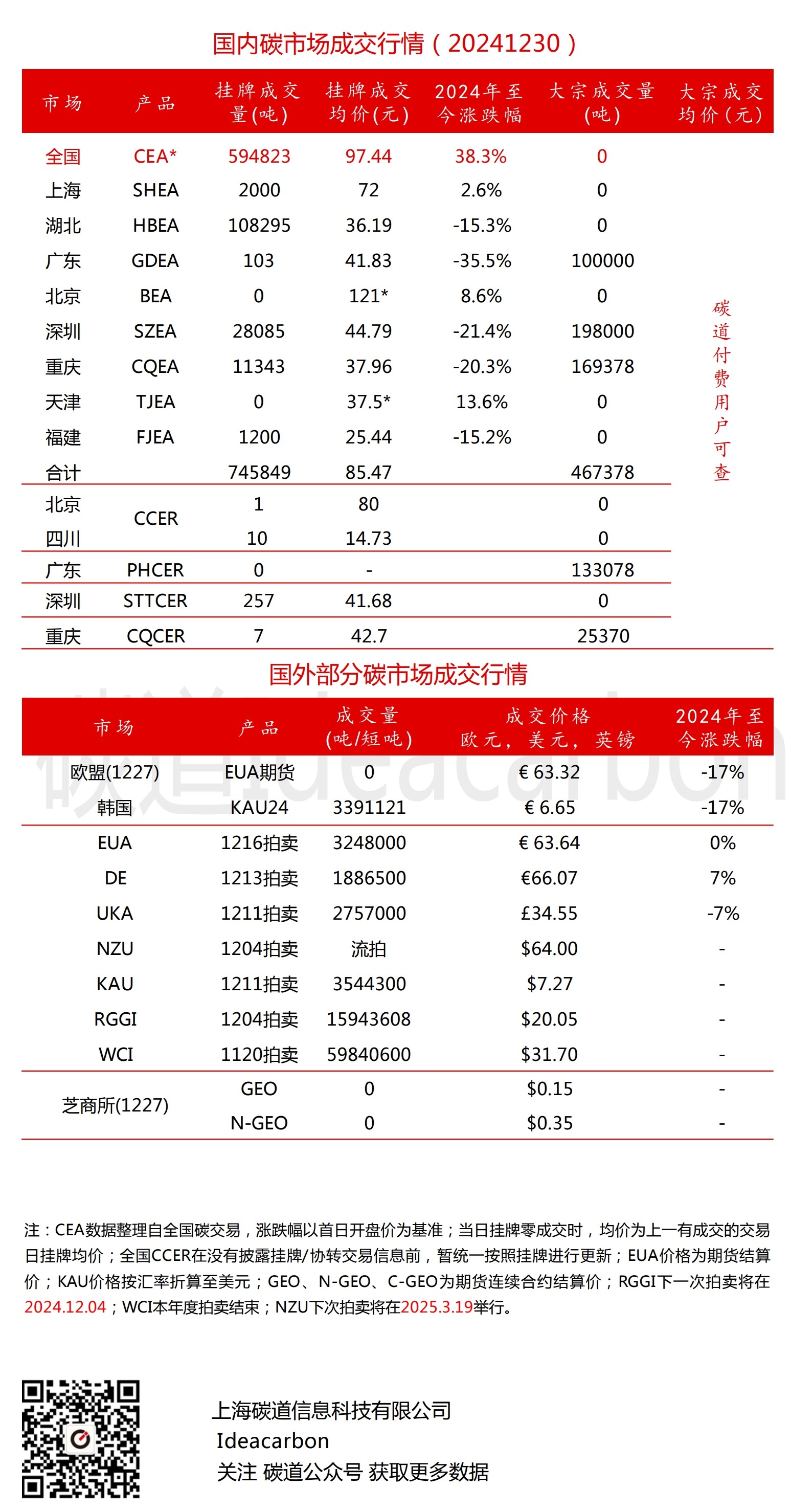 每日碳市场成交行情(20241230)