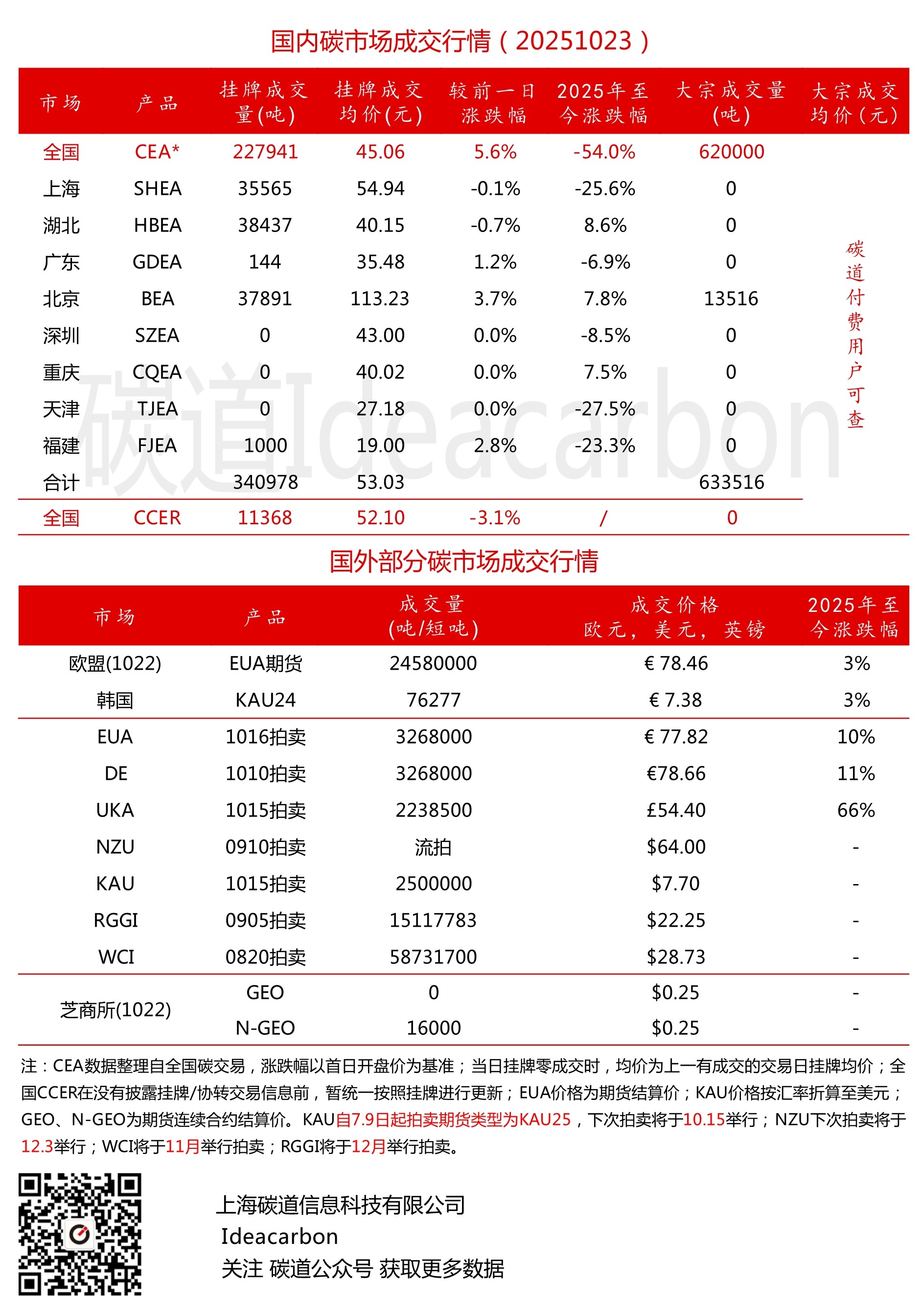 摘要:全国碳配额CEA发生62万吨大宗协议转让,成交均较市场价低0.33%