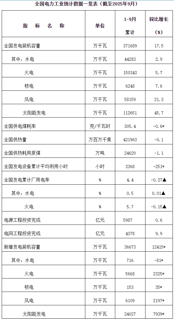 国家能源局发布2025年1-9月份全国电力工业统计数据