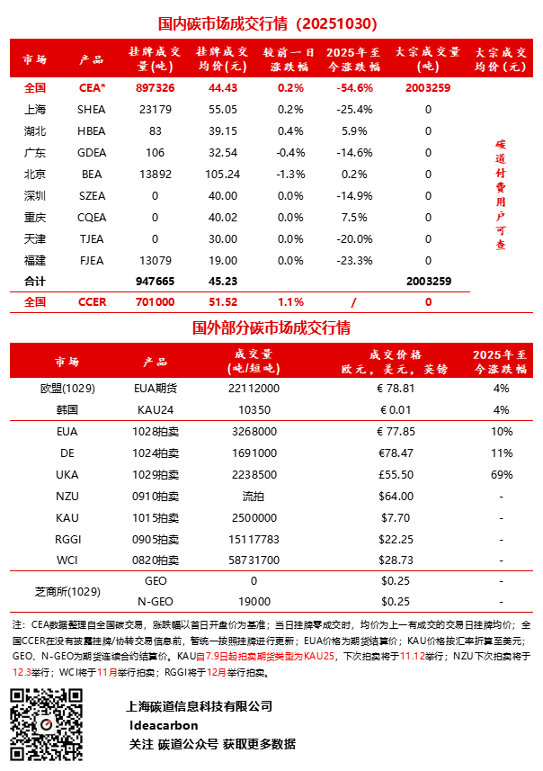 每日碳市场成交行情(20251030)