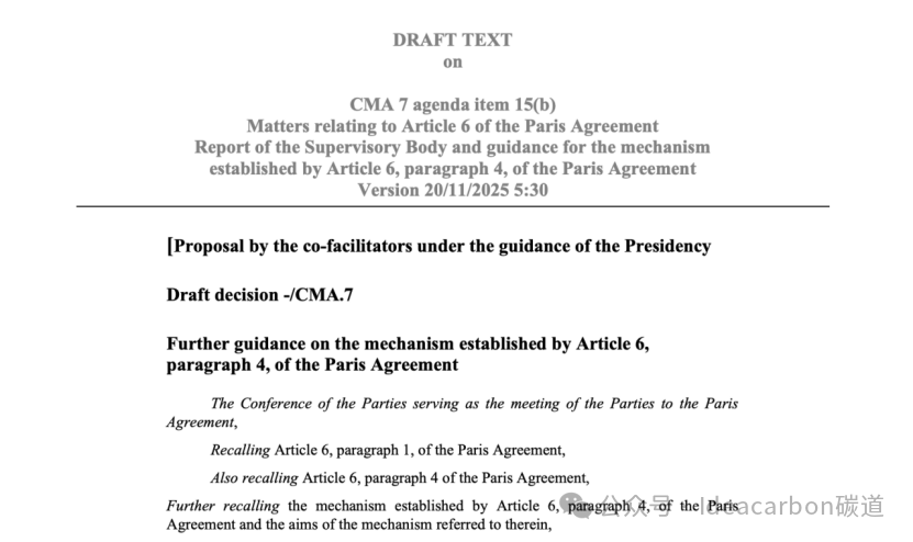 在《巴黎协定》第6.4条机制建设进入实质落地阶段之际,CMA7 11月20日(当地时间)发布的A6.4指导文本成为决定全球碳市场能否按时运行的关键节点。文件不仅总结了监督机构(Supervisory Body, SB)的全年工作成果,更对方法学、治理结构、DCP参与机制、CDM过渡、资金体系和能力建设进行了整体性制度布局,为机制全面上线提供了路线图。相比前期方法学导则为主的制度建设,今年的文本首次呈现出“体系闭环”的迹象,显示A6.4机制即将从制度设计阶段进入规模化运行阶段。