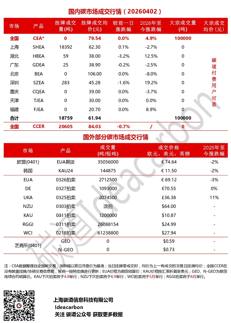 每日碳市场成交行情(20260402)