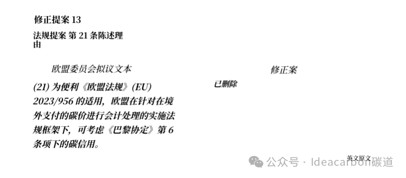 原提案中关于CBAM考虑纳入第六条碳信用的相关表述已被完全删除。这意味着欧盟现阶段不打算在CBAM框架下引入国际碳信用,延续了其一贯立场——CBAM需对标EU ETS的真实碳价,而非引入外部低价碳信用来稀释碳价。CBAM仍将维持其刚性碳定价属性,不会演变为碳抵消市场。