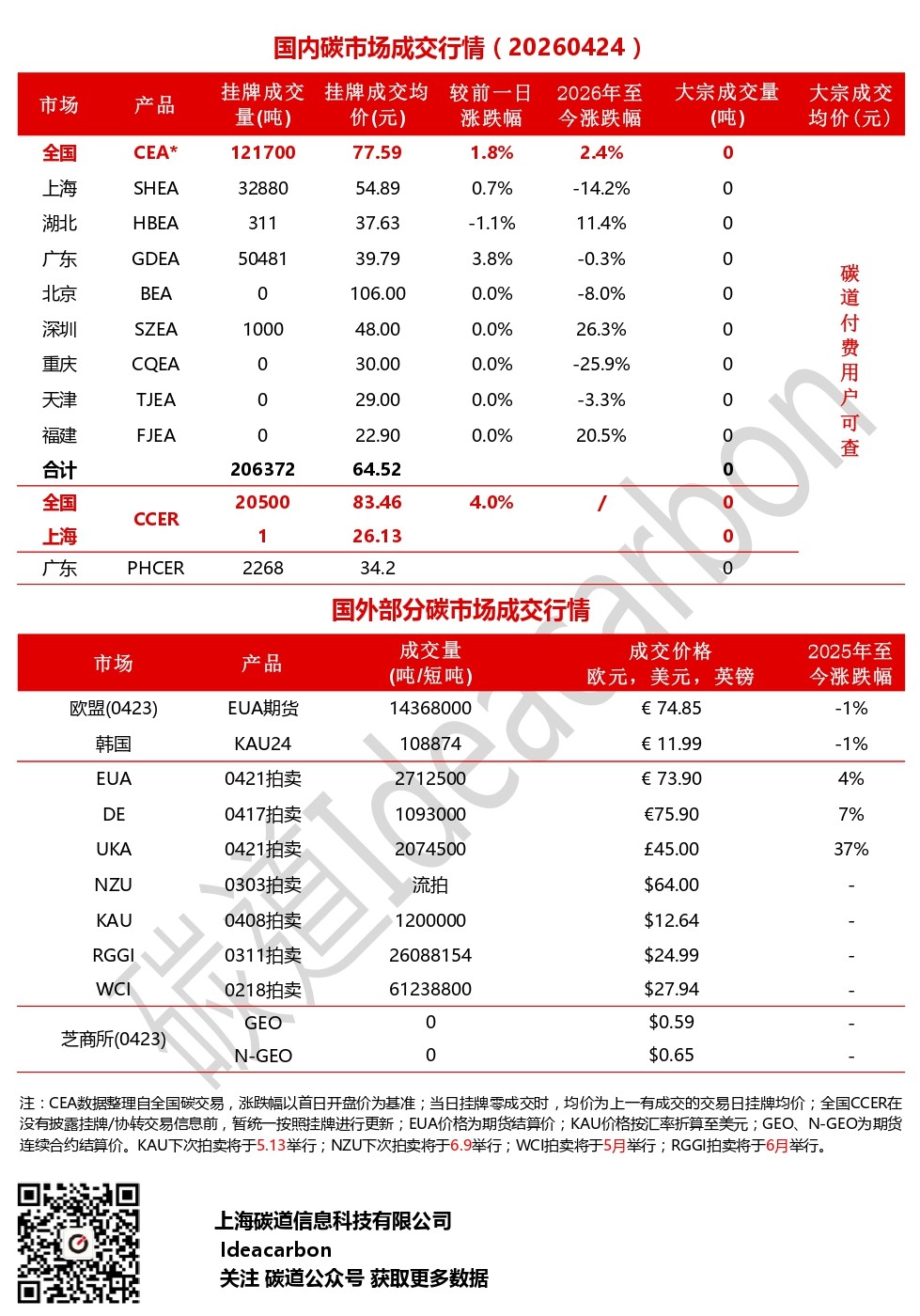 每日碳市场成交行情(20260422)